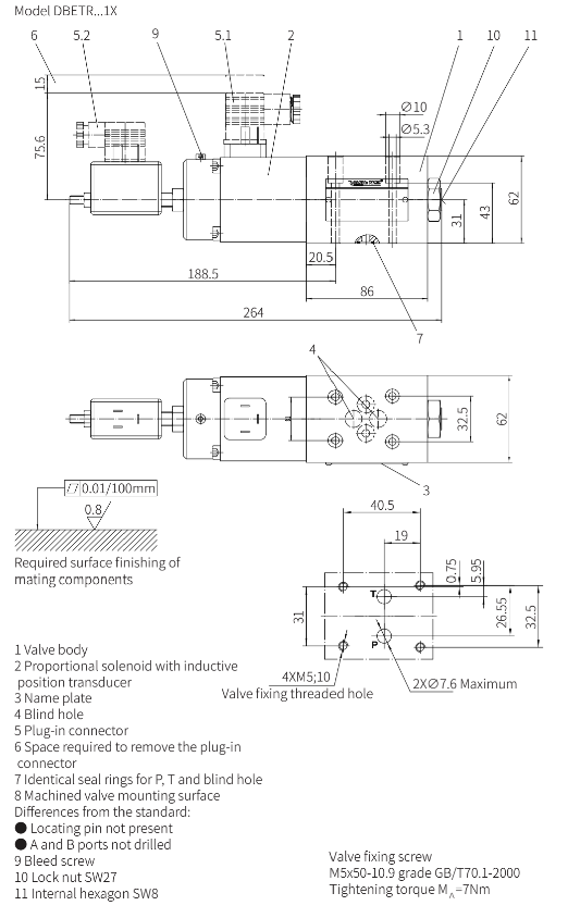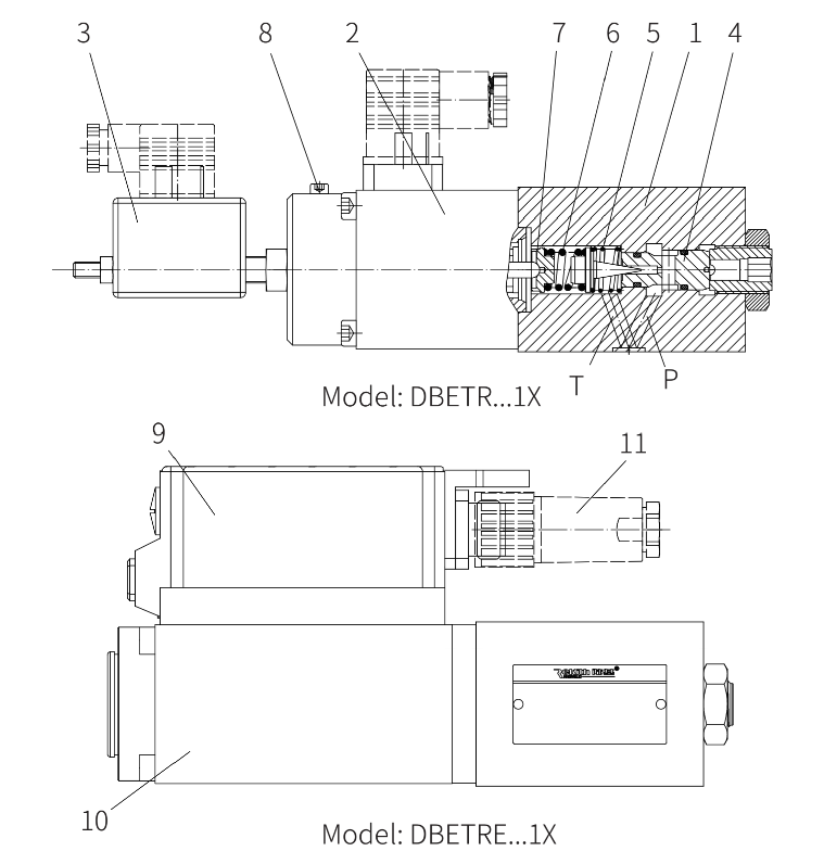 Пропорциональный предохранительный клапан DBETRE-1X функционально идентичен клапану DBETR. Этот клапан оснащен встроенным усилителем (OBE) и пропорционально регулирует давление с помощью внутреннего пропорционального соленоида (10) со встроенным датчиком LVDT. Электрические сигналы подключаются через 7-контактный разъем (11).
