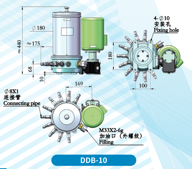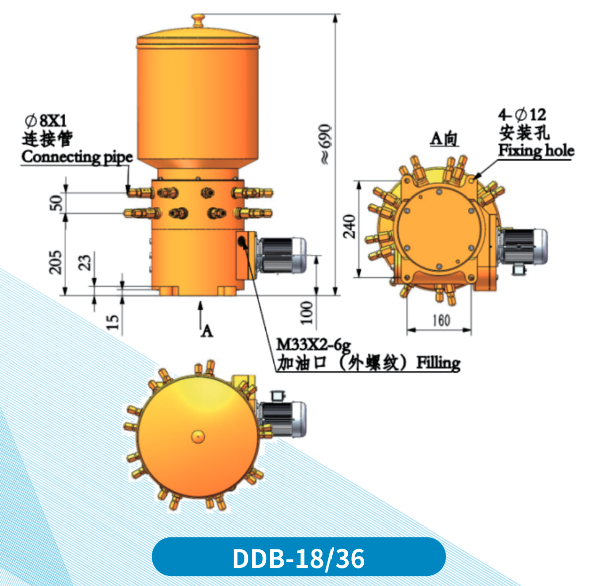 Многоточечный насос подачи густой смазки серии DDB подходит для работы с очень малой частотой смазывания и для систем, где количество точек смазывания не превышает 50 штук. Станция DDB работает с давлением до 10 МПа. Станция густой смазки подходит для дробилок, прессов и станков, портовых кранов, печатных машин и других небольших систем технологического оборудования. Станция DDB может подавать консистентную смазку в любую точку смазки напрямую или через питатель последовательного действия.