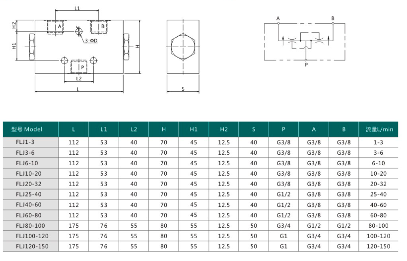 Делитель потока FLJ дроссельного типа имеет трубный монтаж и три канала для подключения трубопроводов. Делит расход на две равные части или суммирует его для реализации синхронизации рабочих органов гидросистемы: гидроцилиндров или гидромоторов. Синхронизация - реакция одного исполнительного механизма на изменение скорости движения другого при изменении нагрузки.