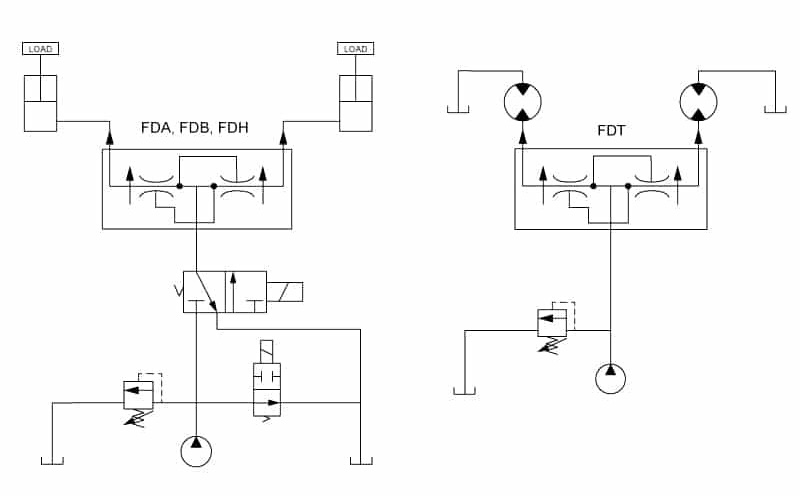 Примеры гидросхем с делителями/сумматорами потока FLJ