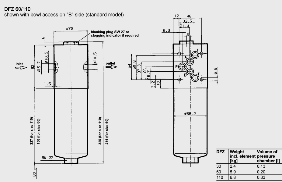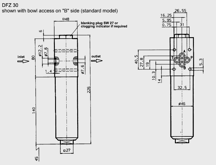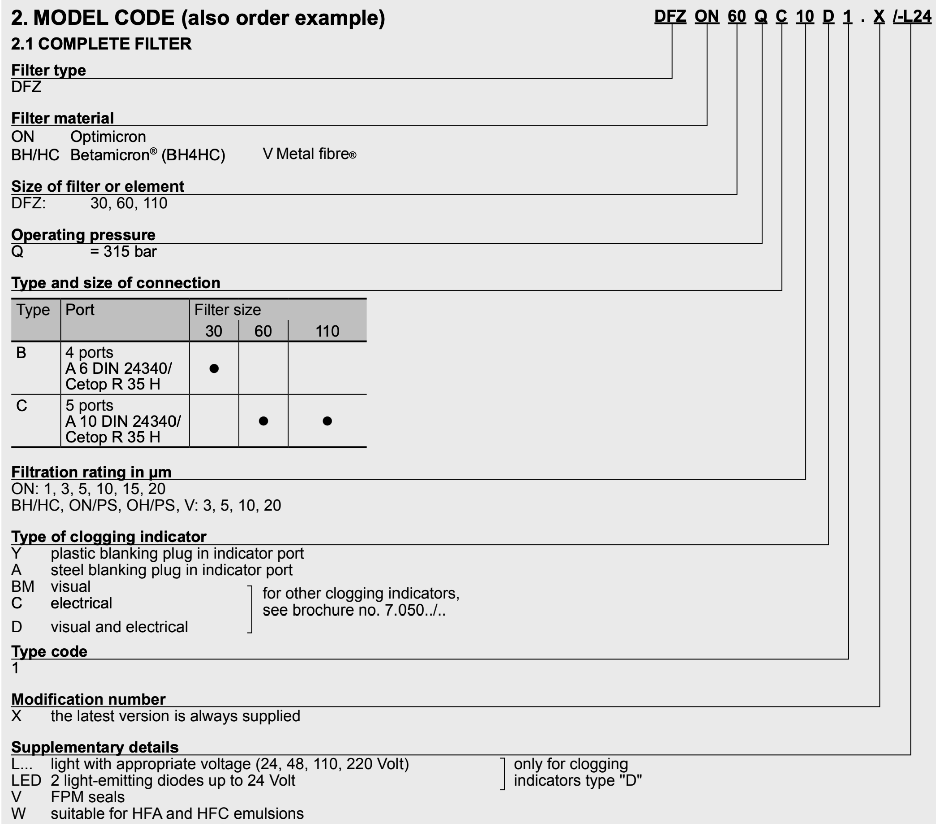 Фильтр DFZ удобен тем, что может быть установлен непосредственно под пропорциональный гидрораспределитель в напорной линии. Это защищает дорогостоящие гидроклапаны от выхода их из строя. В корпус фильтра DFZ вкручивается визуальный, электрический или электровизуальный (ламповый) индикатор загрязнения дифференциального типа. Фильтр DFZ можно заказать с чашей слева или справа для удобства замены элементов. Фильтр DFZ доступен в двух вариантах монтажа для установки в модульные наборы гидроаппаратуры по стандарту CETOP03 и CETOP05. Сменные фильтрующие элементы также доступны для заказа и поддерживаются в наличии на складе компании Гидроответ.