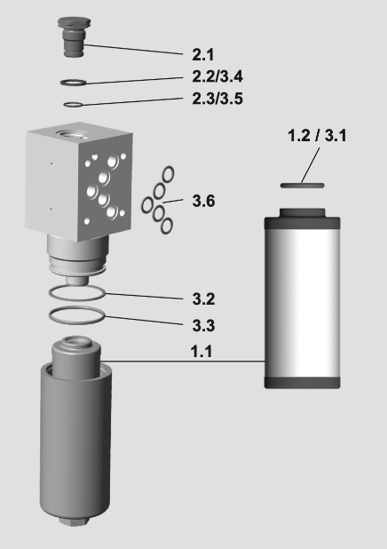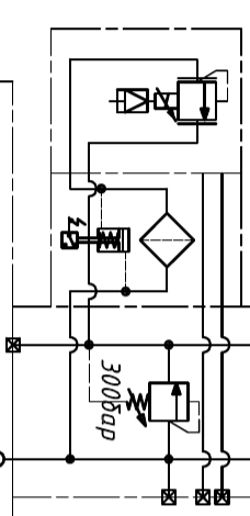 Пример фрагмент гидросхемы с модульным напорным фильтром DFZ, который защищает пропорциональный клапан давления от механических частиц загрязнения размером свыше 10 микрон.