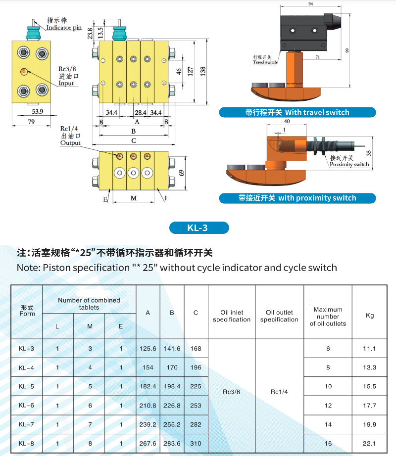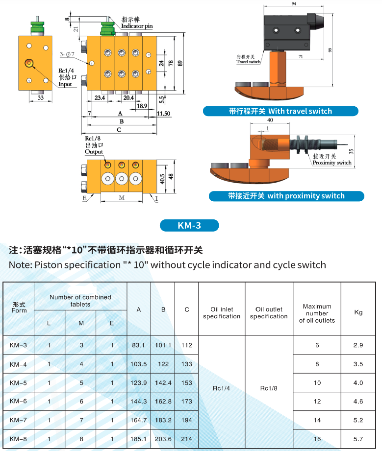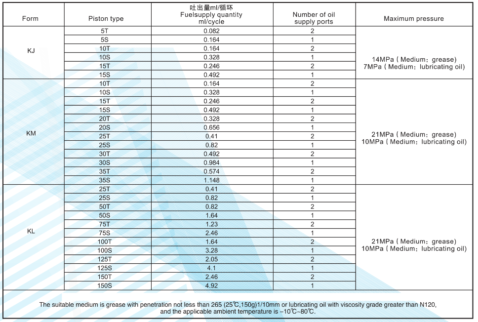 Прогрессивный распределитель KJ, KM, KL состоит из подающих и торцевых секций, изготовленных из конструкционной стали со среднеуглеродистым сплавом. Промежуточные питающие секции выбираются в зависимости от числа выходов (1 или 2) и величины дозы подачи смазки, определяемой в соответствии с требованиями смазываемого оборудования. Подводы смазки в питатель KM и KL расположены с двух противоположных сторон всей сборки. А выходы располагаются по бокам питателя. На каждом выходе питателя KM и KL установлен обратный клапан, который может полностью предотвратить противоток смазочного материала, вызванный обратным давлением в точке смазки, что гарантирует надежную и точную по дозе подачу смазки в каждую точку. Распределители KJ, M, KL подходят для однолинейной централизованной системы смазки с плотным распределением точек смазывания, различным расходом густой смазки, частой подачей смазки и номинальным давлением до 200 бар.
