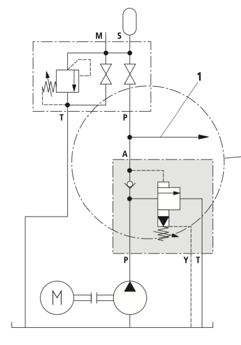 Клапаны отключения давления тип DA применяются в гидросистемах с гидроаккумуляторами давления. Клапаны типа DA осуществляют подачу рабочей жидкости из насоса в систему с гидроаккумулятором до тех пор, пока гидроаккумулятор не наполнится, а давление не достигнет заданного значения настройки гидроклапан. Из канала Р жидкость вначале поступает в обратный клапан, а затем в соединенный с каналом А гидроаккумулятор. На вспомогательном клапане устанавливается давление гидроаккумулятора (давление отключения). Через дроссель в основном поршне давление подается вначале на обратную сторону поршня, на которую действует пружина, а через другой жиклер - на конус предварительного управления. Когда заданное давление достигнуто, конус предварительного управления выталкивается из гнезда, в результате чего на основном поршне возникает перепад давления. Основной поршень движется вверх, открывая магистраль слива рабочей жидкости в бак. Контур гидроаккумулятора перекрывается обратным клапаном. Для того, чтобы разгруженный конус предварительного управления не закрывался, существующее в контуре гидроаккумулятора давление через магистраль управления, расположенную за обратным клапаном (она обозначена красными штрихами), подается на малый поршень конуса предварительного управления. С помощью малого поршня и штока конус отодвигается назад до тех пор, пока давление в гидроаккумуляторе не понизится благодаря расходу жидкости из аккумулятора до такого предела, который в процентном отношении соответствует разности площадей малого поршня и конуса предварительного управления. Затем основной конус закрывается и гидроаккумулятор наполняется.