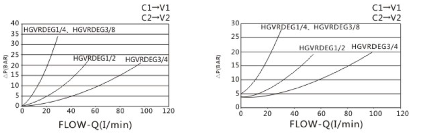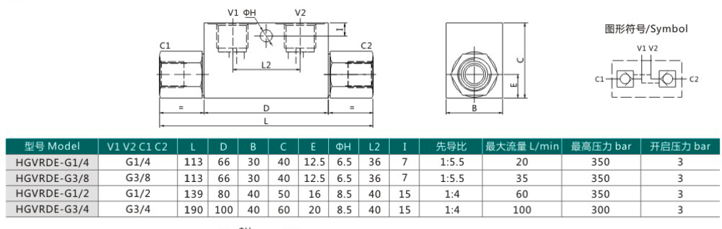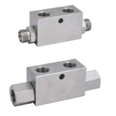 Гидрозамок VRDE имеет резьбовые каналы и предназначен для установки непосредственно рядом с гидроцилиндром или гидромотором за счет трубного монтажа. Функционал гидрозамка VRDE следующий: при отсутствии давления в основных каналах со стороны гидростанции гидрозамок полностью закрыт и герметичен; как только распределитель открывается и пропускает поток в один из каналов А или В, то сдвоенный гидрозамок VRDE отрывается и гидроцилиндр перемещается в соответствующем направлении. За счет данного гидрозамка гидроцилиндр или мотор могут удерживаться в неподвижном положении, когда на них действует внешняя нагрузка в обоих направлениях их движения.
