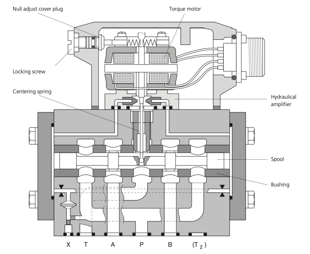Пропорциональные клапаны серии D631 состоят из электромеханического трансформатора (моментного двигателя), гидравлического усилителя (по принципу сопла/заслонки), золотника во втулке и консольной пружины обратной связи. Моментный двигатель содержит катушки, полюсные наконечники, постоянные магниты и якорь. Якорь соединен с гибкой трубкой, которая обеспечивает ограниченное вращение якоря и в то же время изолирует электромагнитные компоненты от гидравлической жидкости.