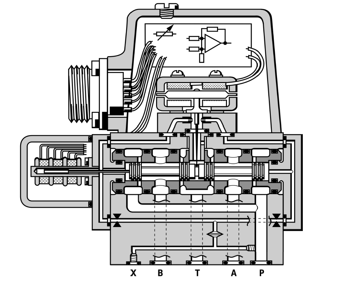 Электрический командный сигнал (заданное значение расхода) подается на встроенный регулятор положения, который приводит в действие контрольную ступень. Система отклоняемых форсунок создает разницу давлений в приводных зонах золотника и влияет на его перемещение. Датчик положения (LVDT), который возбуждается с помощью генератора измеряет положение катушки (фактическое значение, напряжение в положении). Затем этот сигнал демонстрируется и передается обратно в контроллер, где он сравнивается с командным сигналом. Контроллер управляет управляющим каскадом до тех пор, пока ошибка между командным сигналом и сигналом обратной связи не станет равной нулю. Таким образом, положение золотника пропорционально электрическому командному сигналу.
