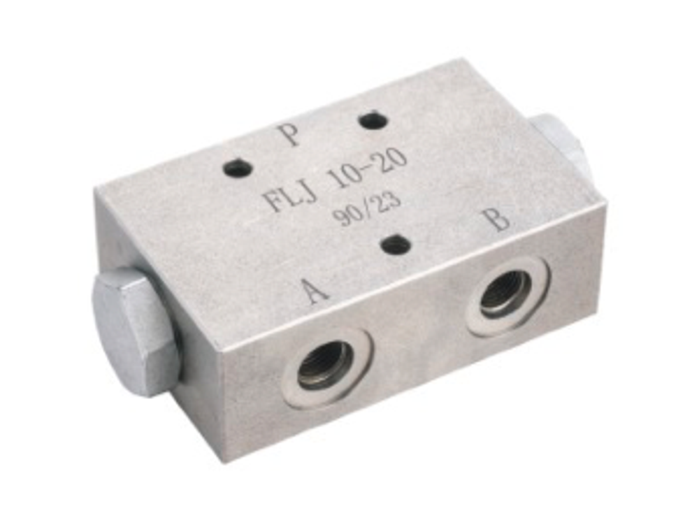 Делитель потока FLJ6-10 дроссельного типа имеет трубный монтаж и три канала для подключения трубопроводов G3/8-G3/8-G3/8. Делитель потока FLJ6-10 разделяет расход 6 - 10 л/мин на две равные части или суммирует его для реализации синхронизации рабочих органов гидросистемы: гидроцилиндров или гидромоторов. Синхронизация - реакция одного исполнительного механизма на изменение скорости движения другого при изменении нагрузки.