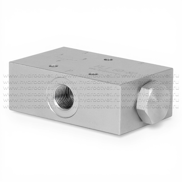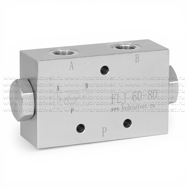 Делитель потока FLJ60-80 дроссельного типа имеет трубный монтаж и три канала для подключения трубопроводов G1/2-G3/8-G3/8. Делитель потока FLJ60-80 разделяет расход 60 - 80 л/мин на две равные части или суммирует его для реализации синхронизации рабочих органов гидросистемы: гидроцилиндров или гидромоторов. Синхронизация - реакция одного исполнительного механизма на изменение скорости движения другого при изменении нагрузки.