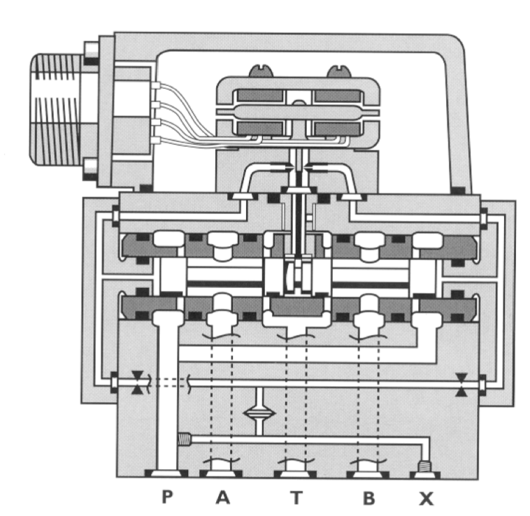 Каскад управления сервоклапана G761-3001B H04JOFM4VPL представлен сдвоенным элементом "сопло-заслонка". Заслонка, расположенная на стержне, связанном с якорем, находится между двумя соплами. Такое расположение создает два регулируемых гидравлических дросселя, проводимость которых зависит от зазора между заслонкой и соплом. Жидкость, проходя через постоянный и переменный дроссели, формирует давление под золотником. Отклонение заслонки меняет давление под разными концами золотника, вызывая его перемещение.