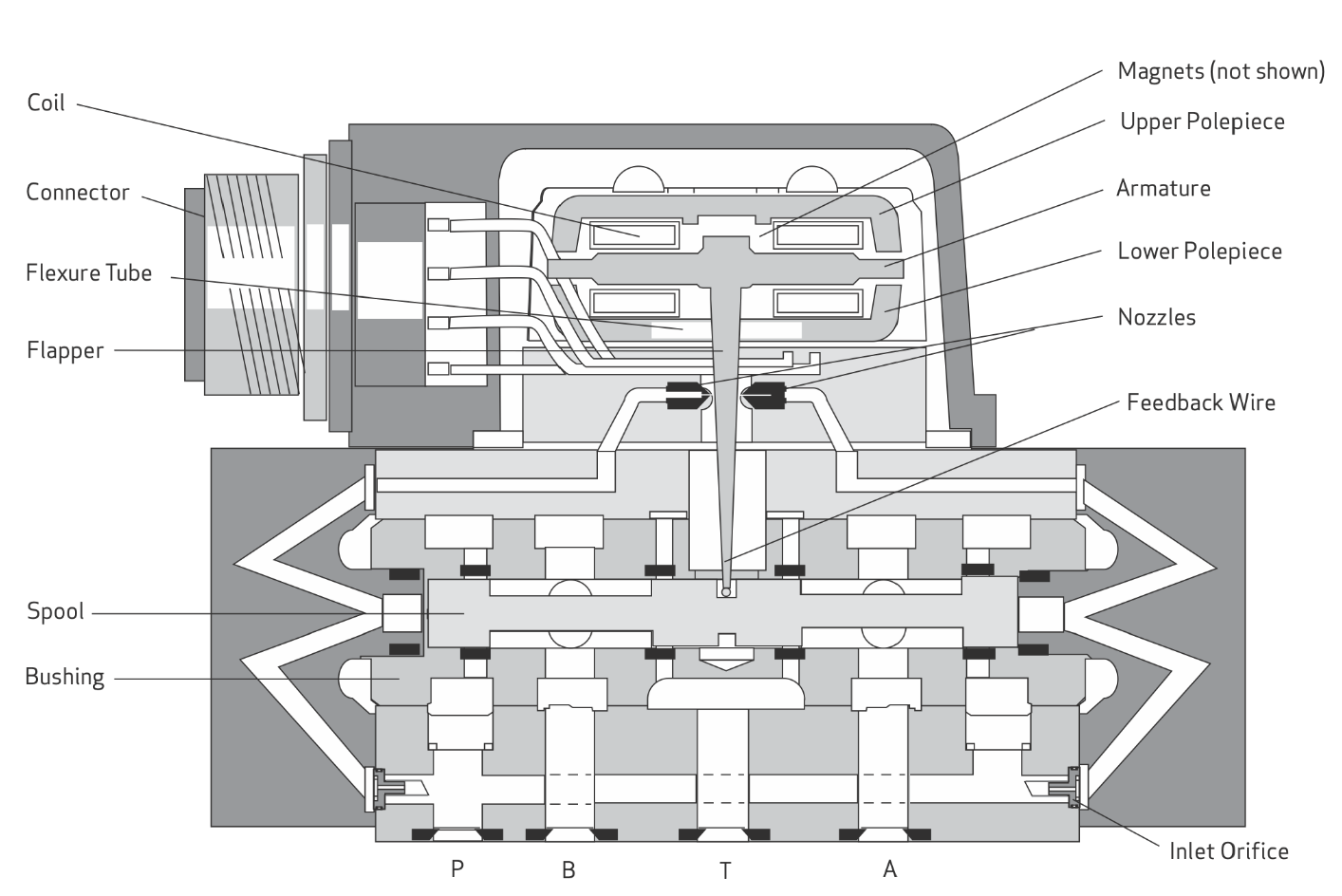 Сервоклапаны для регулирования расхода серии G77X/77X состоят из поляризованного моментного электродвигателя и двух ступеней гидравлического усиления мощности. Якорь двигателя проходит в воздушные зазоры цепи магнитного потока и поддерживается в этом положении гибкой трубкой. Гибкая трубка служит уплотнением между электромагнитной и гидравлической секциями клапана. Якорь окружен двумя обмотками двигателя, по одной с каждой стороны гибкой трубки. Заслонка гидравлического усилителя первой ступени жестко прикреплена к средней точке якоря. Заслонка проходит через гибкую трубку и проходит между двумя соплами, создавая два изменяемых отверстия между наконечниками сопел и заслонкой. Давление, регулируемое заслонкой и регулируемым отверстием сопла, подается в концевые участки золотника второй ступени. Вторая ступень представляет собой обычную четырехходовую конструкцию золотника, в которой выходной поток из клапана при фиксированном перепаде давления в клапане пропорционален смещению золотника из нулевого положения. Консольная пружина обратной связи прикреплена к клапану и входит в зацепление с пазом в центре катушки. При смещении катушки пружина обратной связи повреждается, что создает усилие на узел якорь/клапан. Входные сигналы создают магнитный заряд в якоре и приводят к отклонению якоря и заслонки. Этот узел поворачивается вокруг гибкой трубки и увеличивает размер одного соплового отверстия и уменьшает размер другого. Это действие создает перепад давления с одного конца катушки, что приводит к возникновению силы в тросе обратной связи, которая противодействует первоначальному крутящему моменту входного сигнала. Перемещение катушки продолжается до тех пор, пока усилие на тросе обратной связи не сравняется с усилием на входном сигнале.