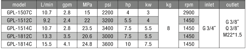 GPL-1814C - Плунжерный насос с расходом 15,5 л/мин, и рабочим давлением до 24,8 МПа имеет частоту оборотов до 1450 об/мин, оснащен пластиковым кронштейном и муфтой для крепления к фланцу электромотора и присоединения к валу электродвигателя мощностью 7,5 кВт. Конструкция насоса серии GPL представляет из себя триплекс плунжеров, корпус головки насоса выполнен из бронзы. Конструкция насоса GPL-1814С полностью герметичная. Коленвал, подшипники, стержни плунжера находятся постоянно в маслянно-смазочной среде, что значительно увеличивает срок службы насоса GPL-1814С. Плунжерные насосы GPL-1814С рассчитаны на перекачивание различных неагрессивных сред, таких как вода и похожие по своему свойству жидкости: масляные эмульсии (HFA, HFB), керосин ТС-1