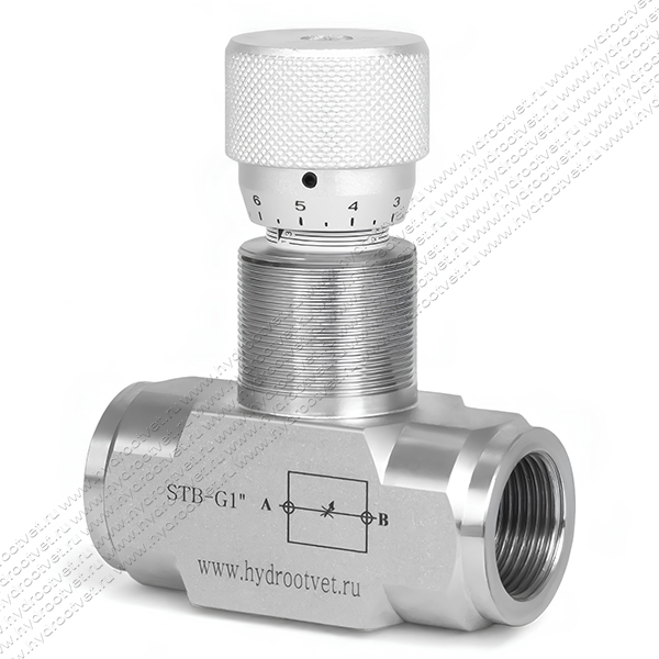 Дроссель трубного монтажа STB-G1-11-1 типоразмера Ду20 с рукояткой предназначен для установки непосредственно в трубопровод при помощи резьбы размером G1. Дроссель STB-G1-11-1 оснащен удобной регулировочной рукояткой со шкалой и фиксатором - это очень удобно, если требуется часто изменять величину расхода масла в гидросистеме, например, на стенде или при смене обрабатываемой детали в станке. Дроссель STB-G1-11-1 выполнен без обратного клапана и регулирует поток в обоих направлениях. Дроссели STB-G1-11-1 служат для бесступенчатой регулировки расхода масла в гидросистеме, то есть скорости исполнительного механизма (гидроцилиндра, например). Регулятор STB-G1-11-1 выполнен из стали 45 и имеет серебряно-цинковое покрытие. Клапаны STB-G1-11-1 производятся в Китае на ведущем заводе-изготовителе гидроаппаратуры, с которым сотрудничает магазин Гидроответ, и являются качественными аналогами одноименного клапана известного немецкого бренда.
