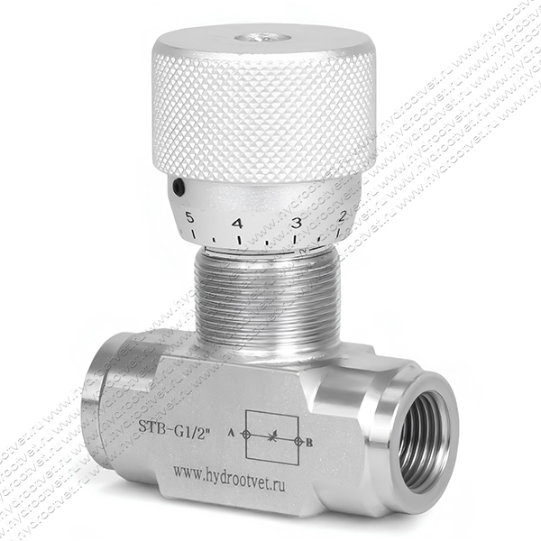 Дроссель трубного монтажа STB-G1/2-11-1 типоразмера Ду16 с рукояткой предназначен для установки непосредственно в трубопровод при помощи резьбы размером G1/2. Дроссель STB-G1/2-11-1 оснащен удобной регулировочной рукояткой со шкалой и фиксатором - это очень удобно, если требуется часто изменять величину расхода масла в гидросистеме, например, на стенде или при смене обрабатываемой детали в станке. Дроссель STB-G1/2-11-1 выполнен без обратного клапана и регулирует поток в обоих направлениях. Дроссели STB-G1/2-11-1 служат для бесступенчатой регулировки расхода масла в гидросистеме, то есть скорости исполнительного механизма (гидроцилиндра, например). Регулятор STB-G1/2-11-1 выполнен из стали 45 и имеет серебряно-цинковое покрытие. Клапаны STB-G1/2-11-1 производятся в Китае на ведущем заводе-изготовителе гидроаппаратуры, с которым сотрудничает магазин Гидроответ, и являются качественными аналогами одноименного клапана известного немецкого бренда.