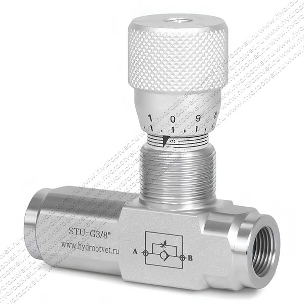 Дроссель трубного монтажа STU-G3/8-1111-1 типоразмера Ду10 с рукояткой предназначен для установки непосредственно в трубопровод при помощи резьбы размером G3/8. Дроссель STU-G3/8-1111-1 оснащен удобной регулировочной рукояткой со шкалой и фиксатором - это очень удобно, если требуется часто изменять величину расхода масла в гидросистеме, например, на стенде или при смене обрабатываемой детали в станке. Дроссель STU-G3/8-1111-1 выполнен с обратным клапаном в параллели для свободного тока рабочей жидкости. Соответственно, STU регулирует расход масла только в одном направлении. Дроссели STU-G3/8-1111-1 служат для бесступенчатой регулировки расхода масла в гидросистеме, то есть скорости исполнительного механизма (гидроцилиндра, например). Регулятор STU-G3/8-1111-1 выполнен из стали 45 и имеет серебряно-цинковое покрытие. Клапаны STU-G3/8-1111-1 производятся в Китае на ведущем заводе-изготовителе гидроаппаратуры, с которым сотрудничает магазин Гидроответ, и являются качественными аналогами одноименного клапана известного немецкого бренда.