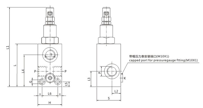 Предохранительный клапан давления VMP-G3/4-250 автоматически открывается и снижает давление в контуре до любого уровня, превышающего заданный в даиапзоне от 50 до 250 бар. Клапан VMP-G3/4-250 выполнен в виде стальной плиты с двумя отверстиями G3/4 для напорной магистрали и одним отверстием G3/4 для подключения к сливной магистрали Т, идущей в бак, что обеспечивает удобство его монтажа в линию без применения дополнительных фитингов для создания "тройника". Также имеется заглушенной отверстияе М10х1 для плюключения измерительной точки или манометра.